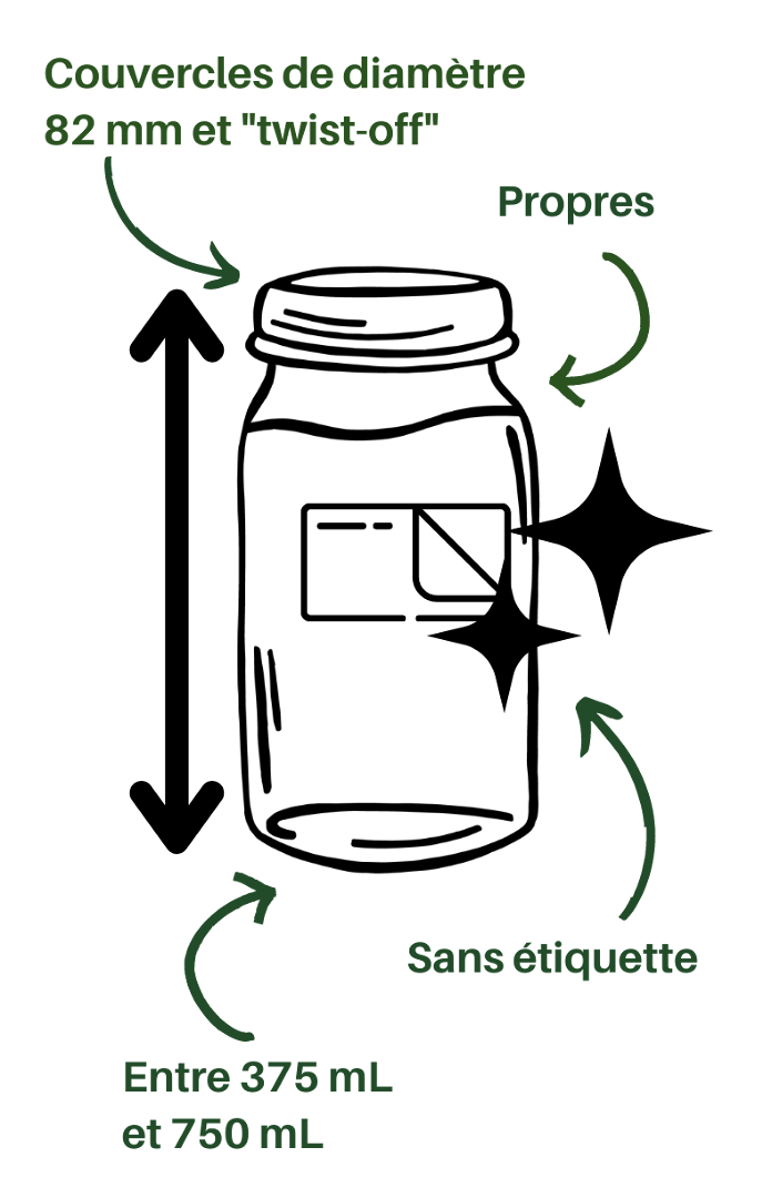 Les bocaux : Facilement identifiables, grâce à leur étiquette avec notre logo, nous les reprenons rincés et sans leur étiquette.